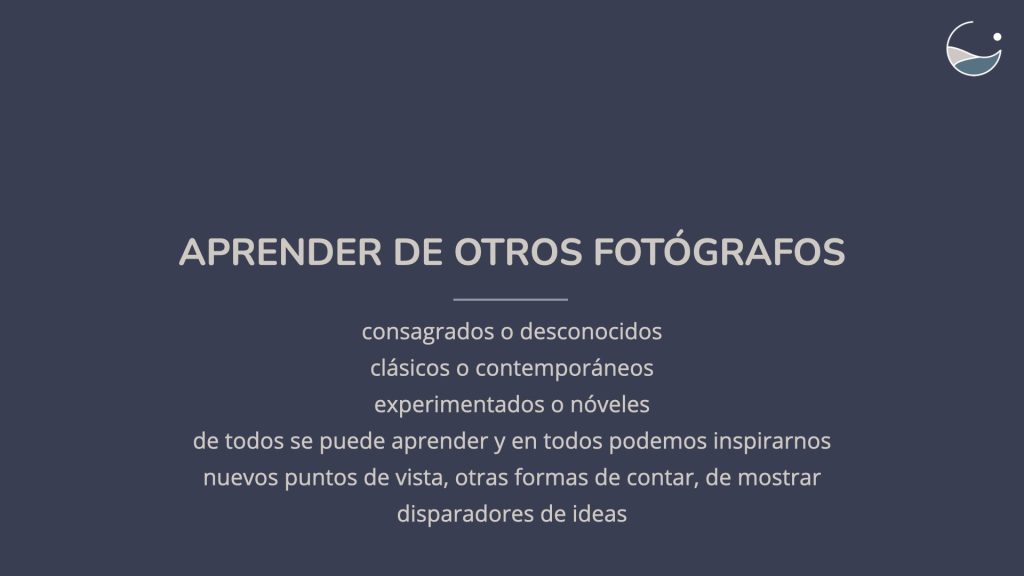 A su vez, el desarrollo y aprendizaje de las herramientas compositivas lo hacemos analizando la obra de fotógrafos de distintas escuelas y visiones, lo que sirve como una gran introducción a la historia de este arte y como inspiración para investigar la obra de muchos de ellos.